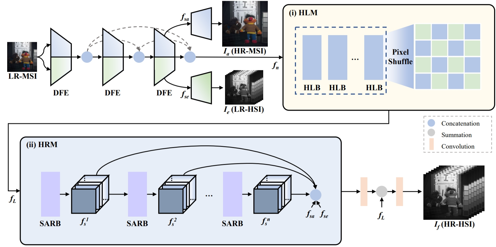 An illustration of the proposed Hybrid Learning Network (HLNet). The key modules detailed are (i) the Hybrid Feature Learning Module (HLM) and (ii) the Hybrid Feature Reconstruction Module (HRM).